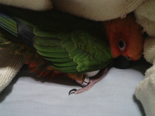 やはり、ビリーは♂ですかねw!?遊んで欲しいのに奈々が布団の中に入るもんで、拗ねて自分にずーっと張り付いてます。ですが奈々も奈々で暫く温めた後お腹が空いて布団の外に出て来ると、温めるのを忘れてしまうようです!セキセイのピーちゃん程の母性本能は無いみたいですよ!!