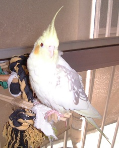 イエローフェイスシナモンパールで体はクリーム色っぽい、羽にグレー色の模様が混ざっています。(名前:イチゴ)