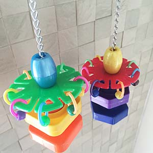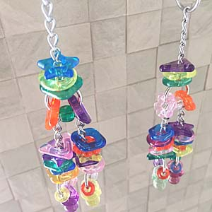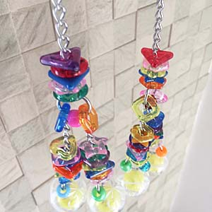 キラキラでジャラジャラで、元気のいい、おもちゃと戦う格闘家の鳥さんなら、テンションあがっちゃうこと間違いなし。