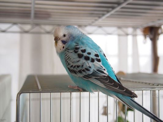 水色のメス。手や指に乗るのを嫌がりますが、肩や頭の上、腕などに留まります。人には慣れています。