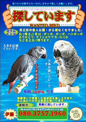 経過報告を致しますと: 迷子になってから今日で15日も経ってしまいました。チラシ600枚、自転車捜索距離計は140km弱、オートバイで230km、動物探偵社さんと1週間ほど捜査協力してもらいましたが見つかりませんでした。15日に武蔵関4丁目の電線に止まっているヨウム発見情報を頂き、武蔵関公園から石神井公園の間と小金井公園も探してみました。一昨日チラシ貼り紙を見た方から大泉学園5丁目付近で15日か16日頃に見かけた情報も頂きました。食べ物の事を考えると‥、出来ればどこかの養子になって生きていてくれている事を願っています。