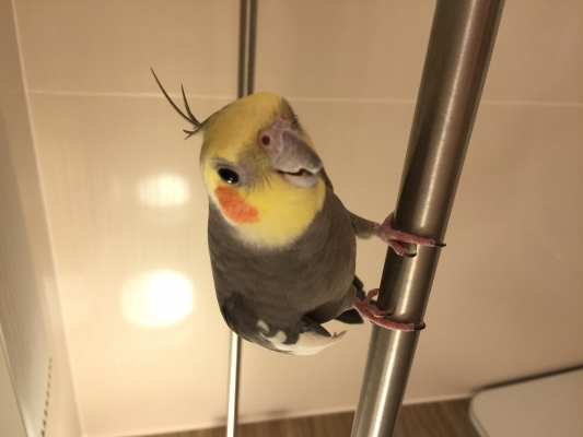 ノーマルの2歳で名前が小羽(こはね)といい、「こはちゃん」「こはね」「こはちゃんおいで」と呼ぶと反応し、オカメ自身も「こはちゃん」「こはね」「こはちゃんおいで」と喋ります。