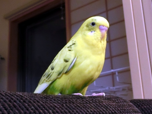 【特徴】 全身が黄色です。羽の一部と顔に黒色が入っています。背中から、尾羽にかけて、緑色が入っています。頬に白い毛があります(時期により、青も入るようです)。