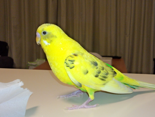 【特徴】 全身が黄色です。羽の一部と顔に黒色が入っています。背中から、尾羽にかけて、緑色が入っています。頬に白い毛があります(時期により、青も入るようです)。