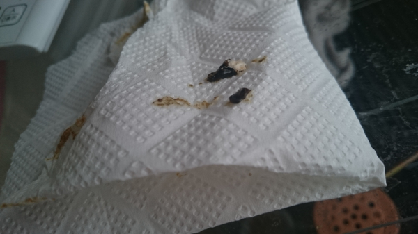 >帰宅し便を見ると黒色便に粒便がありました。普段はペレットですが食べてもらうためにシードを混ぜてましたが、シードが未消化。
