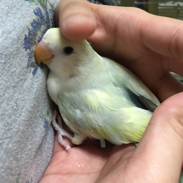 生後1ヶ月(5/21生まれ)のホワイトフェイスノーマルのオカメインコ、さくをお迎え。