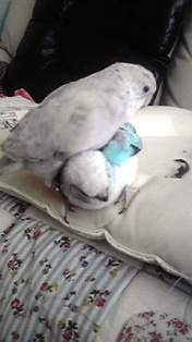 の手乗りインコたちと愛犬たち(カラーダックス5匹)と白猫1匹、