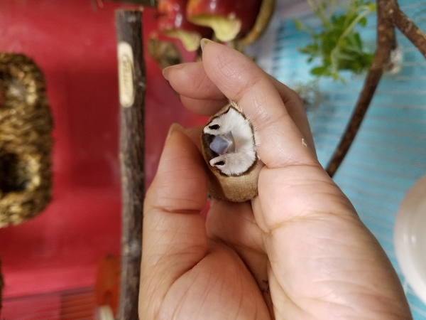 嘴の色と顔の色が半分こになった茶色い中雛→ますます茶色くなってアゲイト疑惑やパステル疑惑もある謎三毛文鳥→現在はゴマ桜に。