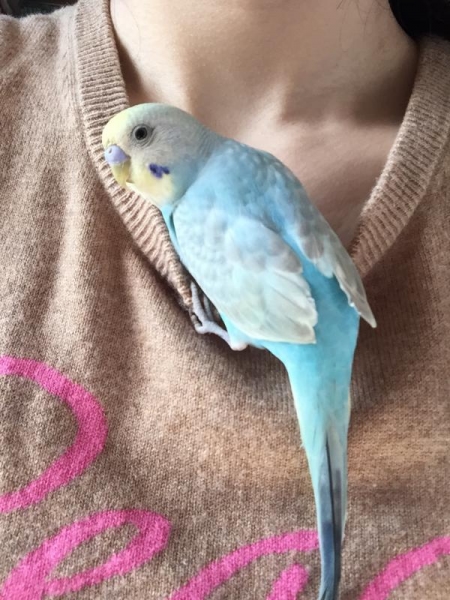 2018年4月20日、ケージを掃除する時が、3階のドアから逃がしてしまいました。まだ、生まれてから半年、少しおしゃべりができます、鼻が水色、男の子、水色、頭が黄色、手と肩に乗ります。セキセイインコが日進市赤池近くで迷子になってしまった。