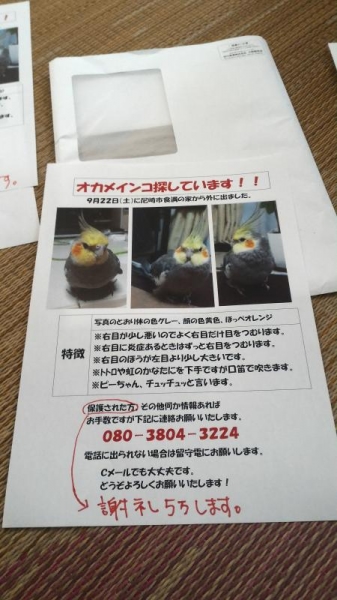 9月22日に兵庫県尼崎市食満でオカメインコが迷子になりました