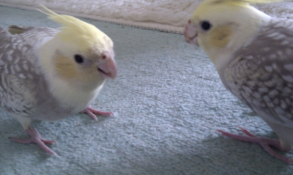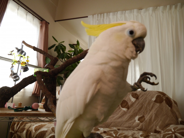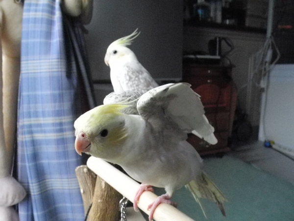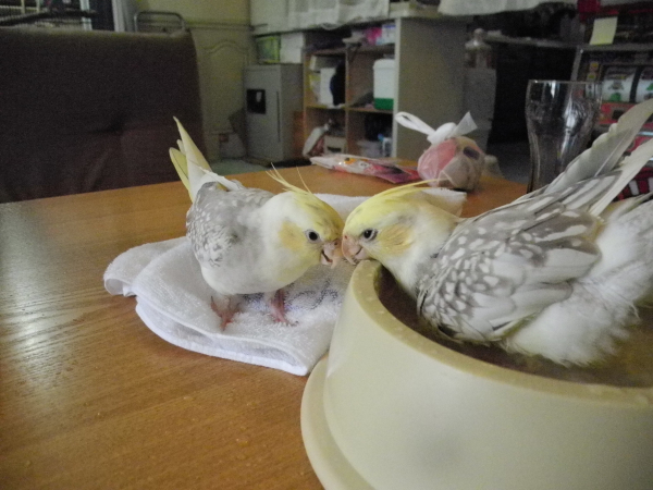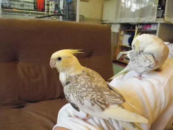2013.05.04 17:25 ナナのママ 久しぶりにパソコンと向き合い書き込みしています。 ムムもモモも、もちろんナナも元気です。相変わらず羽はかじっていますが…… ナナは以前よりまだマシで羽もやや綺麗になり、今では部屋中を運動場のように走りまわっています。 ムムとモモは相変わらずムムの一方通行ですが、モモちゃんも少し発情してきて2回卵を産みました。無精卵ですが、一生懸命産んでるモモに「モモちゃん〜。モモちゃん!」と繰り返し鳴いているムムがとてもいじらしく大人に見えました。