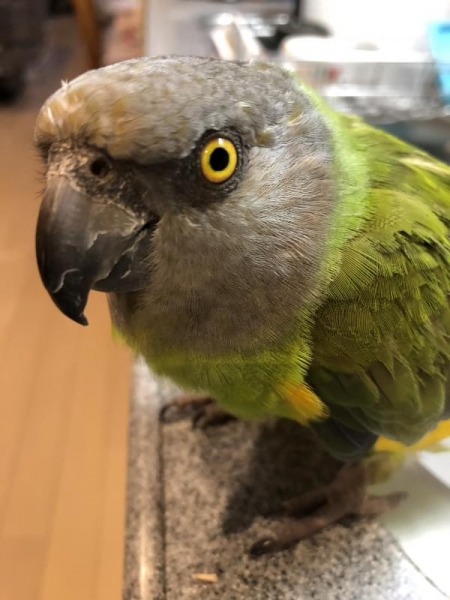 - ヒナの時からお世話しています。ショップで初めて出会った時に真っ直ぐに私の首もとに飛びついて、しがみついてプスプス鳴いて甘えてくれました。それから3年以上大切なパートナーです。寂しがりやさんで一時は毛引きもありましたが今は羽根が少しずつ回復してきています。大好きなオヤツはバナナとベリーです。