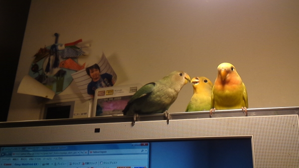 緑の子を一番最初に買ってその1年後に黄色い子を買ったのですが、緑の子がすーごいヤキモチ妬きで人間大好き年長者なのでデカい顔して過ごしてます(笑)コザクラの代名詞ラブバードのような仲良しには今後もなれそうにないですね。オス同士なのもあると思いますがwちなみにその1年後に来たセキセイへの態度も、同じ感じです^^;
