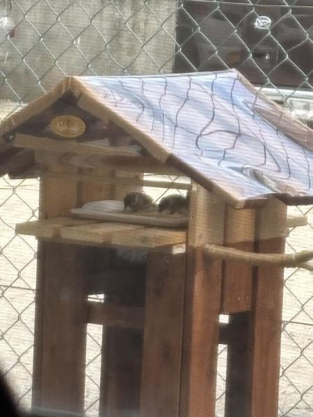 ルーのために作っていた温室を解体して、今は野鳥たちのための小さなCaféを作ってみました。