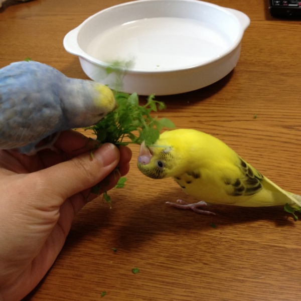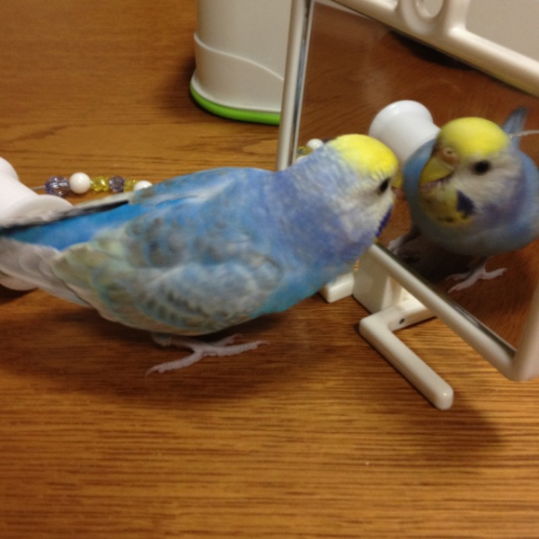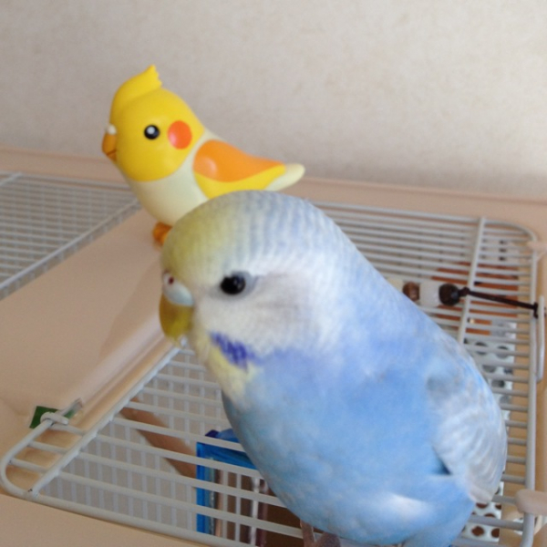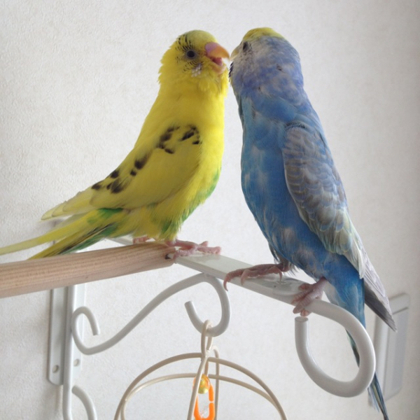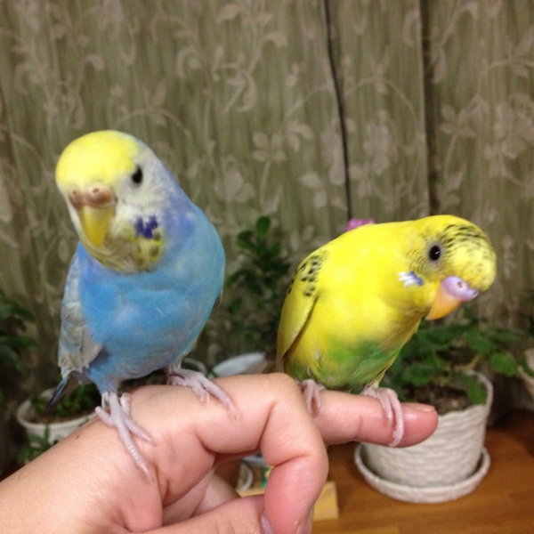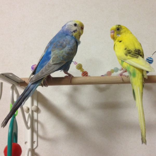パステルレインボーのPOPちゃんと、黄色ハルクインのピピちゃんの2羽飼いしています♪