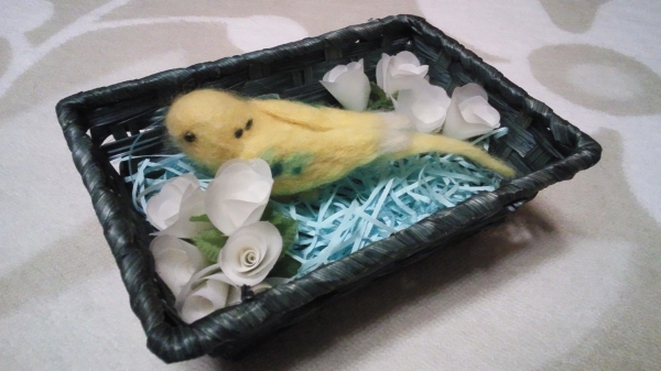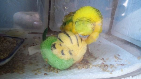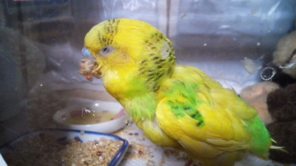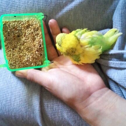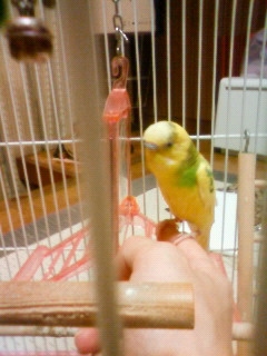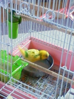 7年前…1月に老衰でゴンちゃんを亡くなくし、新しい仔のお迎えを考えてはいたけど…なかなか勇気が出なく、少し諦めていた。たまにしか買い物に行かないデパート(少し小さい)に行ったらペットショップがあるのは知っていたけど、ダメもとでインコを見に行った。インコはカゴに3匹ぐらい入ってるカゴが3~4並んでいて、当時ルビーは手乗りインコと言うことで一匹でカゴに入っていた。黄色くて可愛いインコちゃんだな…って思ってたら、ペットショップのお姉さんが「手乗りなのでだしますよ」って言ってくれて、その時に「ルビーちゃん」とお姉さんに呼ばれていた。手乗りの割にはすぐ飛んで行ってしまって…お姉さんの言うこと全然聞いてなかった。でも、お姉さんの肩に乗ると落ち着いてとても可愛かった。それからは即決、考える間もなくルビーを買っていた。名前は変えても大丈夫ですよ、と言われたけどそのままルビーの名前をもらいました。小さな箱に入って、ビニール袋に入れて、当初の目的は晩ごはんの買い物に来ていたので、ルビーの入った袋を慎重に持ち。冷凍品の所では寒くないよう箱を抱いて、海鮮の所では生臭くないよう行かなかったり、変な気を使ったりしたけど…もの凄く嬉しかった。買い物しながらニヤニヤしてたと思う。
