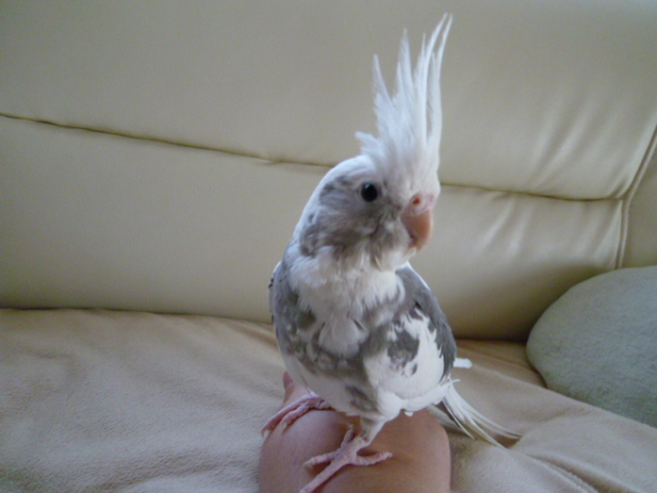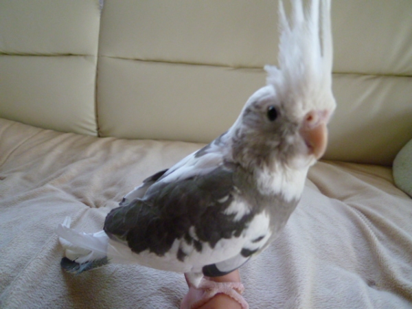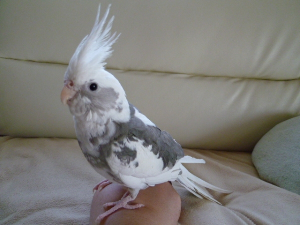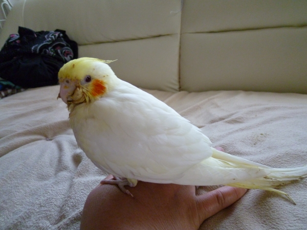 雛でお迎えし、挿し餌で育てました。とても人懐っこく育てやすいこでした。飼い主の肩でウトウトするのが好きです。頭ナデナデが大好きでいつもうっとりしてます。体格が良くBIGバードです。水浴びが大好き♪