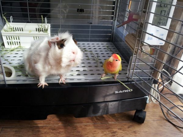 初めまして、モルモットの餌を買いに行ったショップにいたコザクラインコに息子が一目惚れしました。どうしても黄色でお顔がピンクの鳥さんが欲しいと。そんな事があって、初めてインコを飼う事になりました。インコの可愛い仕草、愛嬌に驚く毎日です。
