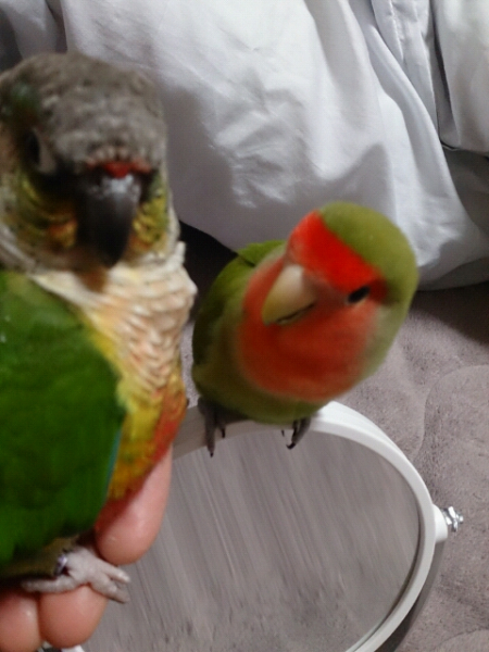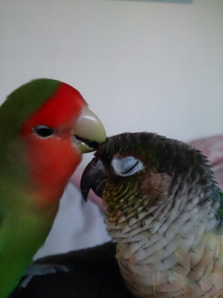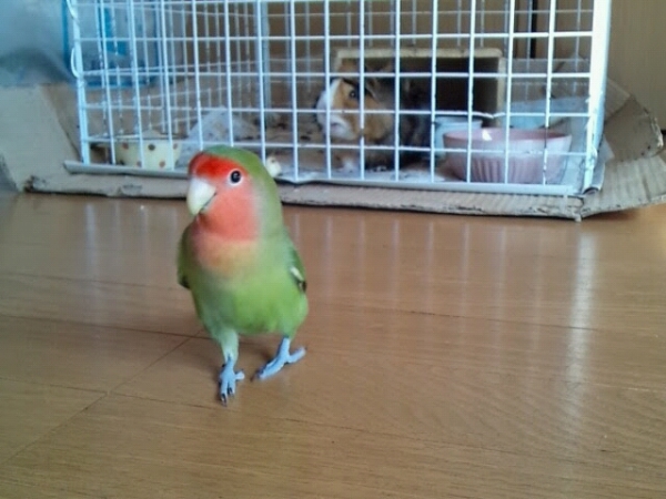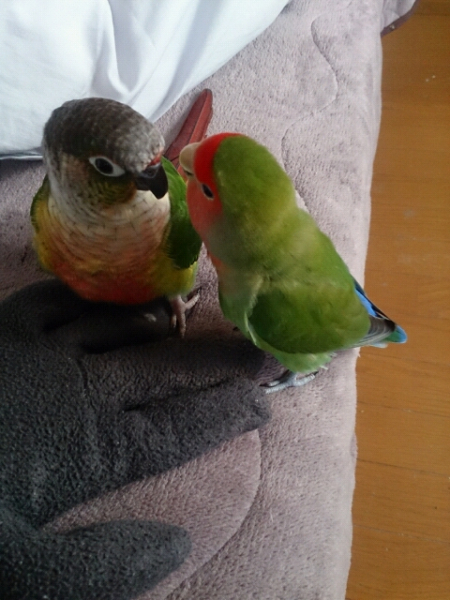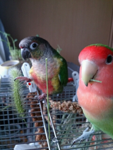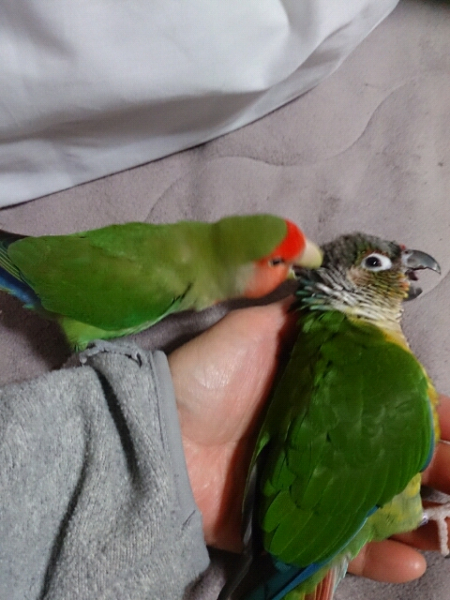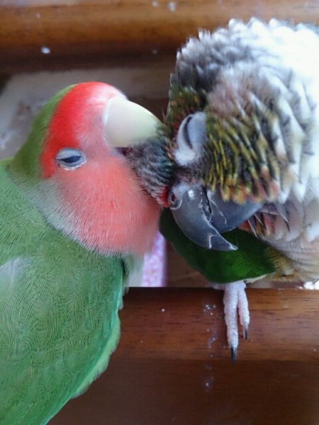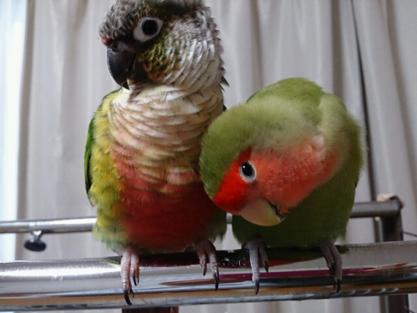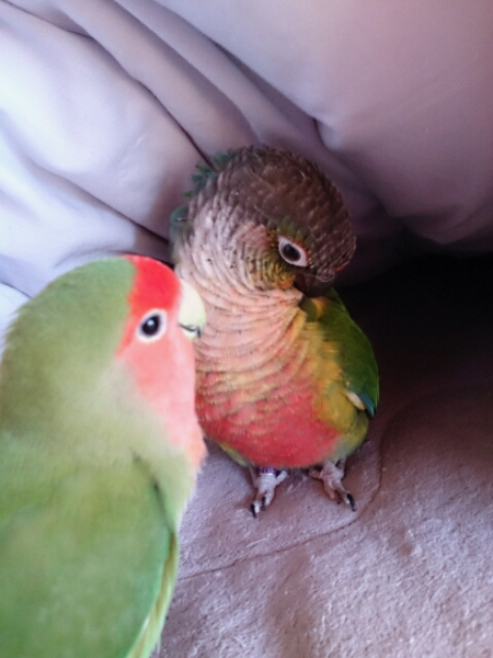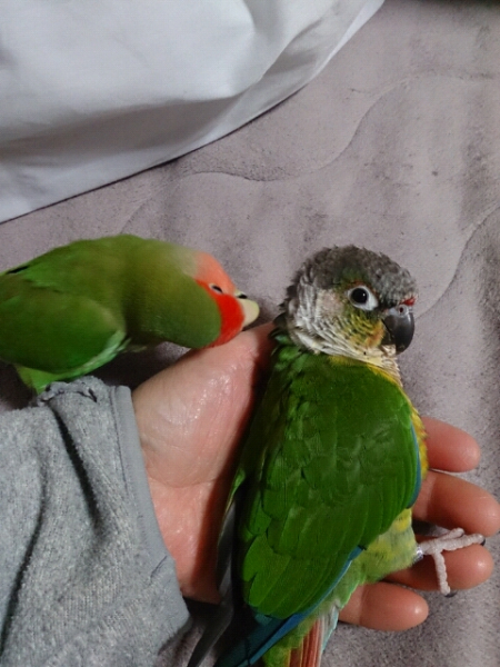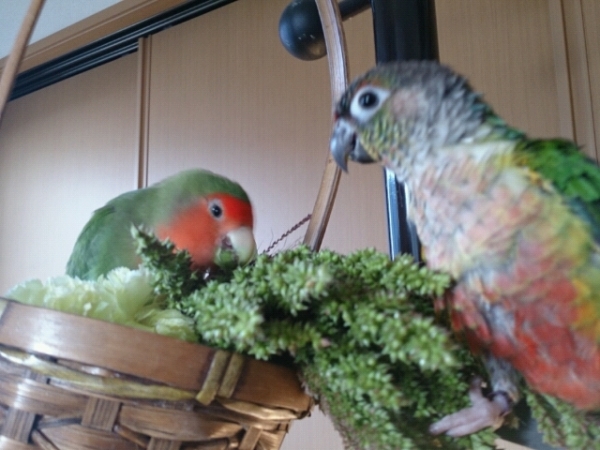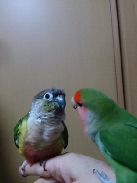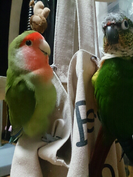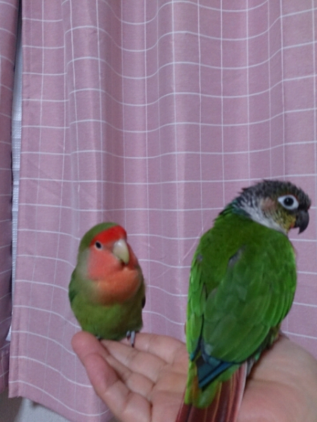 小桜インコのぴ~ちゃんとワキコガネウロコインコのケロちゃんを飼っています(^O^)