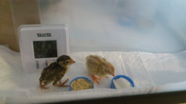 うずらを2羽飼っています。オスのこげ茶はシジミ、メスのシナモンベージュはホタテです。