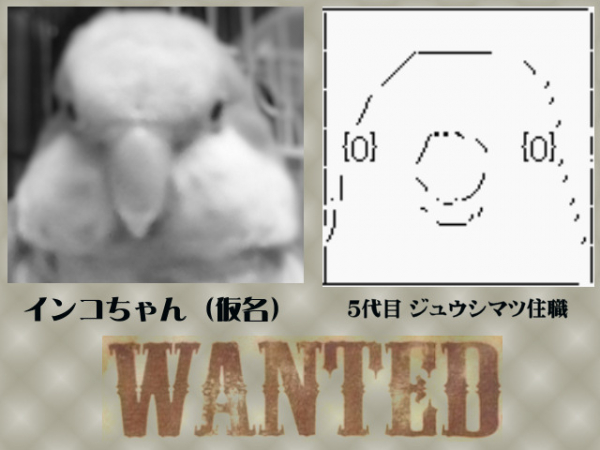 探偵ナイトスクープに登場したキョロちゃんと同じ、オキナインコ(2009年8月生まれ)を飼っています。