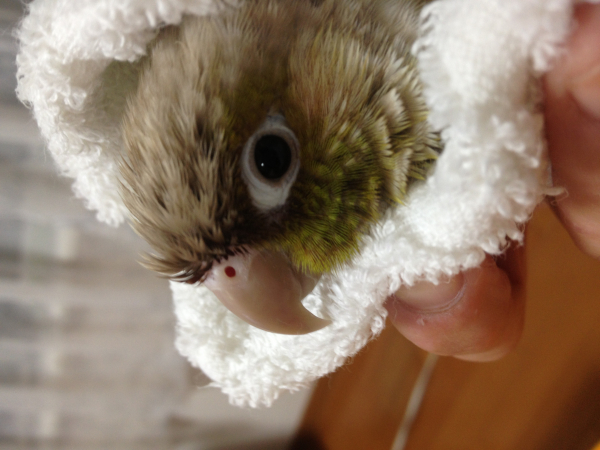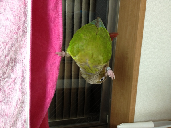 ピーちゃん(ホオミドリアカオウロコインコ)の飼い主です。 ピーちゃんは2013/03/10生まれ、一人餌になってから家にやって来ました。