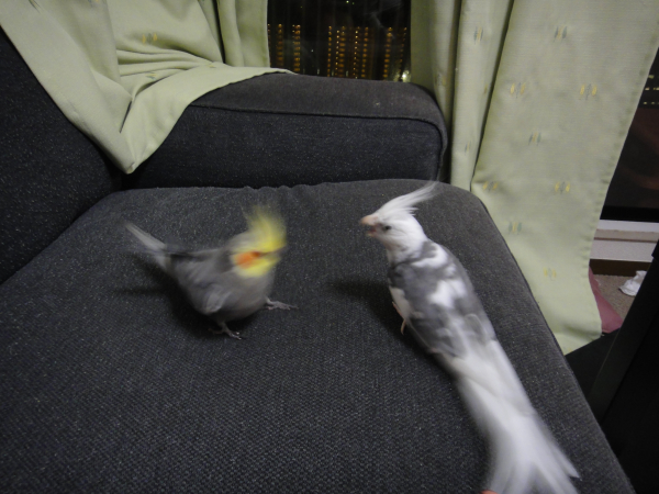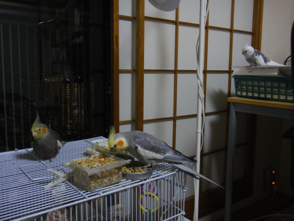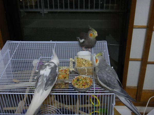 オカメ2羽(ノーマル♂1歳10か月児、白♂9歳10か月児、ノーマル♀2歳2か月児)と生活してます。