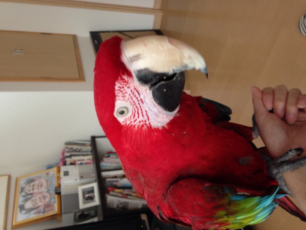 ベニコンゴウインコ、ヒメコンゴウインコと41羽の仲間たちと生活しています。